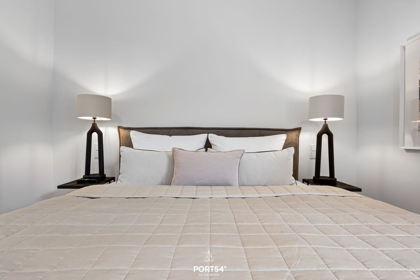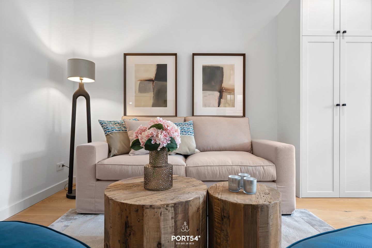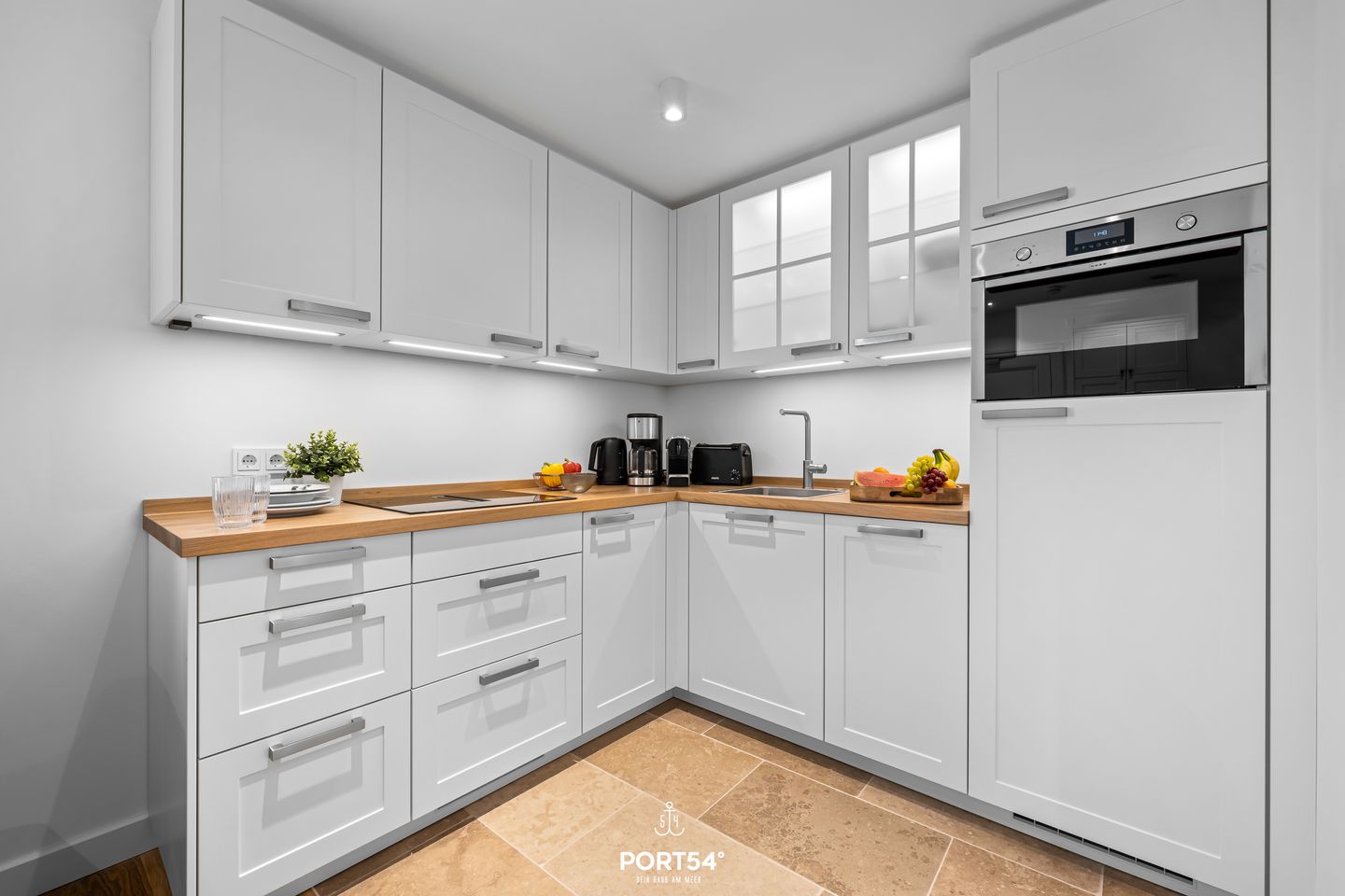 Mit einer großzügigen Grundfläche von 45 m² bietet die im Erdgeschoss gelegene Ferienwohnung ausreichend Platz für bis zu drei Personen. Die lichtdurchfluteten Räume sind geschmackvoll eingerichtet und die offene Küche, die zum Wohnzimmer hin gestaltet ist, lädt dazu ein, kulinarische Köstlichkeiten zuzubereiten. Hier finden Sie alle notwendigen Geräte wie einen Elektro-Herd mit Induktionskochfeld, einen Backofen, eine Spülmaschine, einen Kühlschrank mit Gefrierfach und vieles mehr. Das Schlafzimmer ist mit einem gemütlichen Doppelbett, Verdunkelungsmöglichkeiten und einem Smart TV ausgestattet.