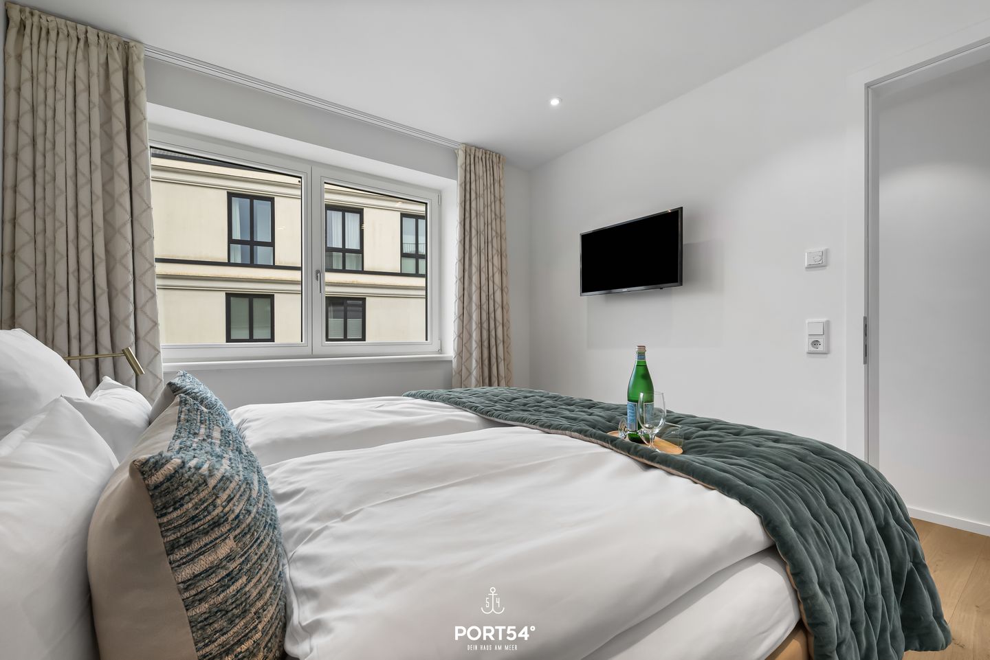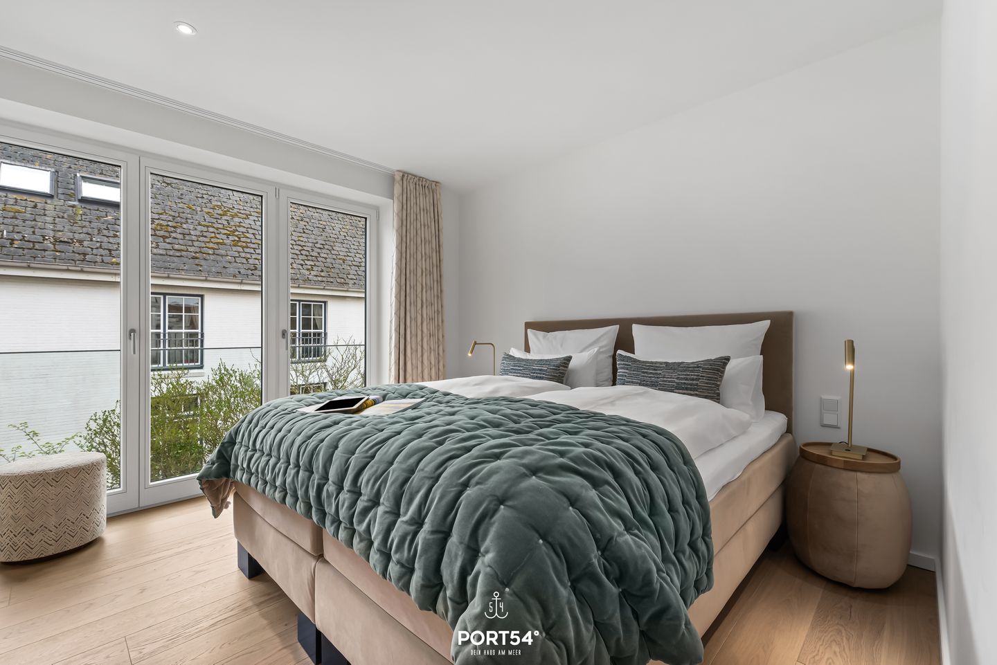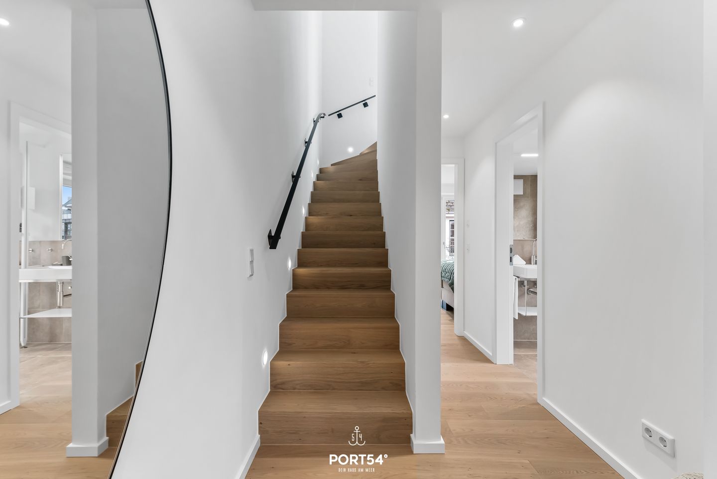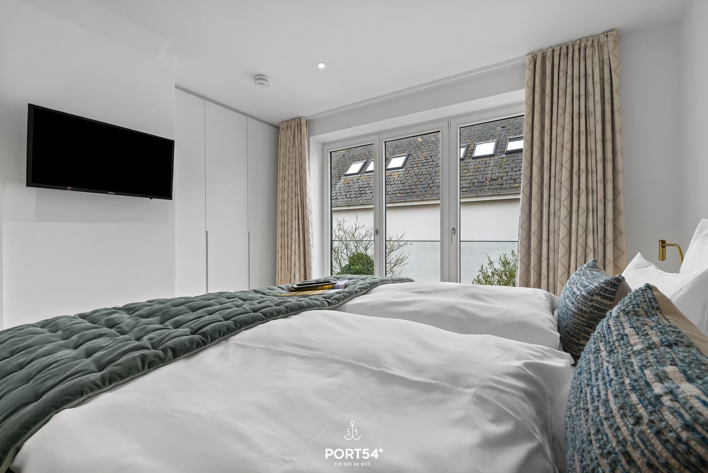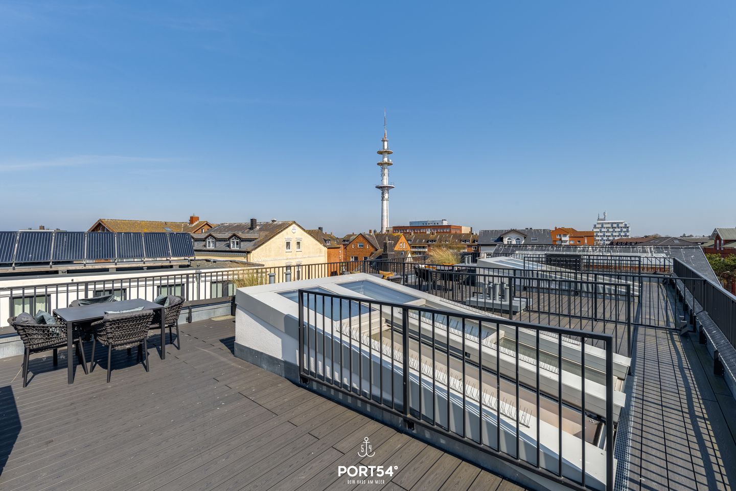 Das Luxus Maisonette Apartment bietet im 1. und 2. Obergeschoss Platz für bis zu vier Personen. Auf der ersten Etage erwarten Sie die beiden Schlafzimmer mit je einem Doppelboxspringbett, Flachbild-TV und Verdunkelungsmöglichkeiten, perfekt für Ihre Nachtruhe. Außerdem finden Sie auf der Etage das Master-Bad mit Doppelwaschbecken, Regendusche, Föhn und WC. Im zweiten Obergeschoss befindet sich der offene Wohn- und Essbereich mit vollausgestatteter Küche, Balkon und Zugang zur großen Dachterrasse. Hier haben Sie genug Platz um die frische Nordseeluft auf dem Dach zu genießen.
