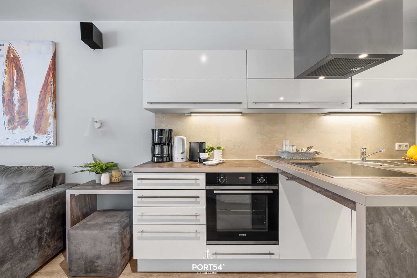 Die Küche ist offen zum Wohnbereich gestaltet und verfügt über zahlreiche Annehmlichkeiten: Induktionskochfeld, Backofen, Mikrowelle, Geschirrspüler, Kühlschrank mit separatem großzügigen Gefrierfach, Nespresso-Espressomaschine, Kaffeemaschine, Wasserkocher und Toaster sowie sämtliches Koch- und Essgeschirr. Damit sind sowohl kleine Snacks als auch aufwändigere Mahlzeiten problemlos zuzubereiten.